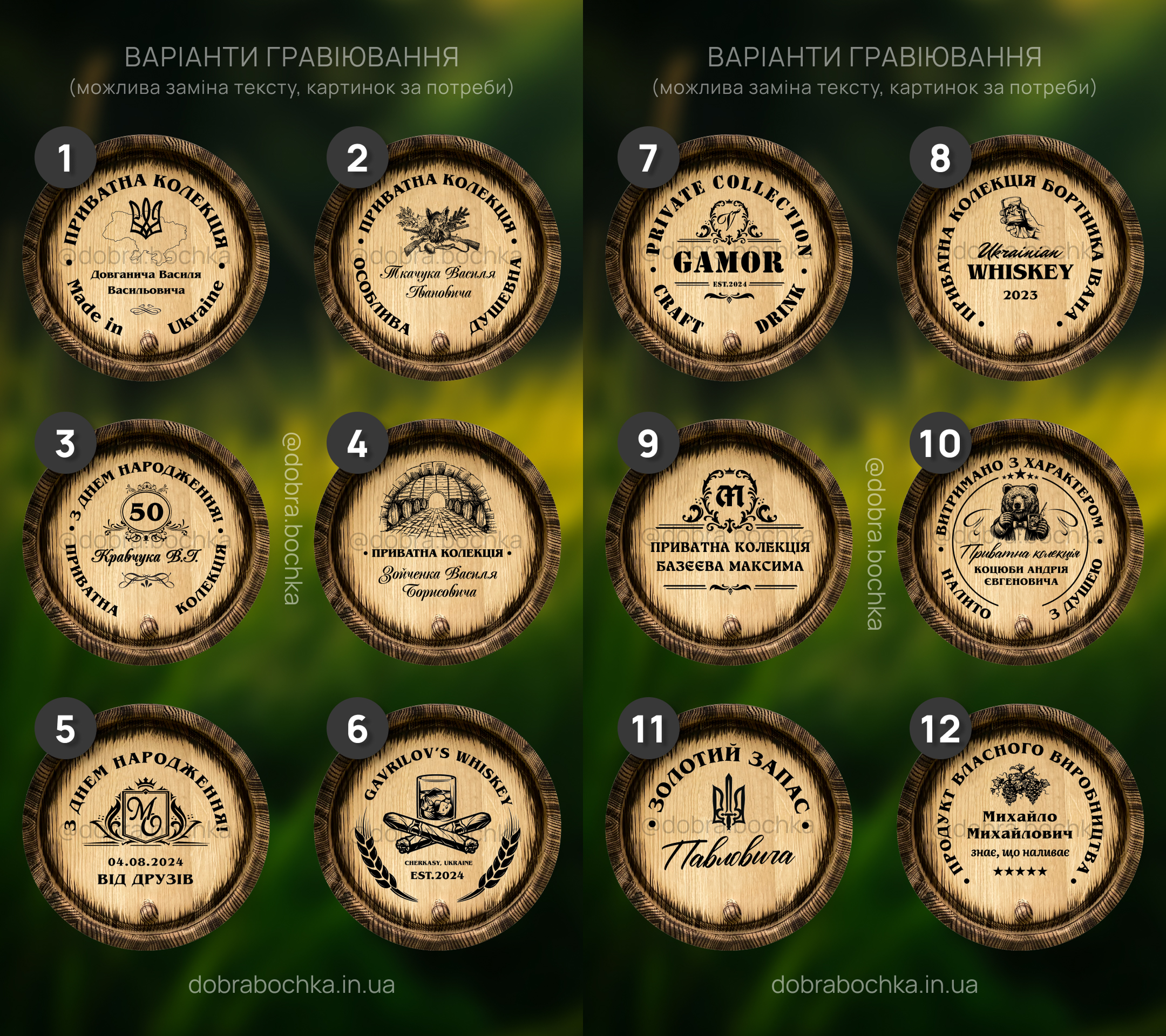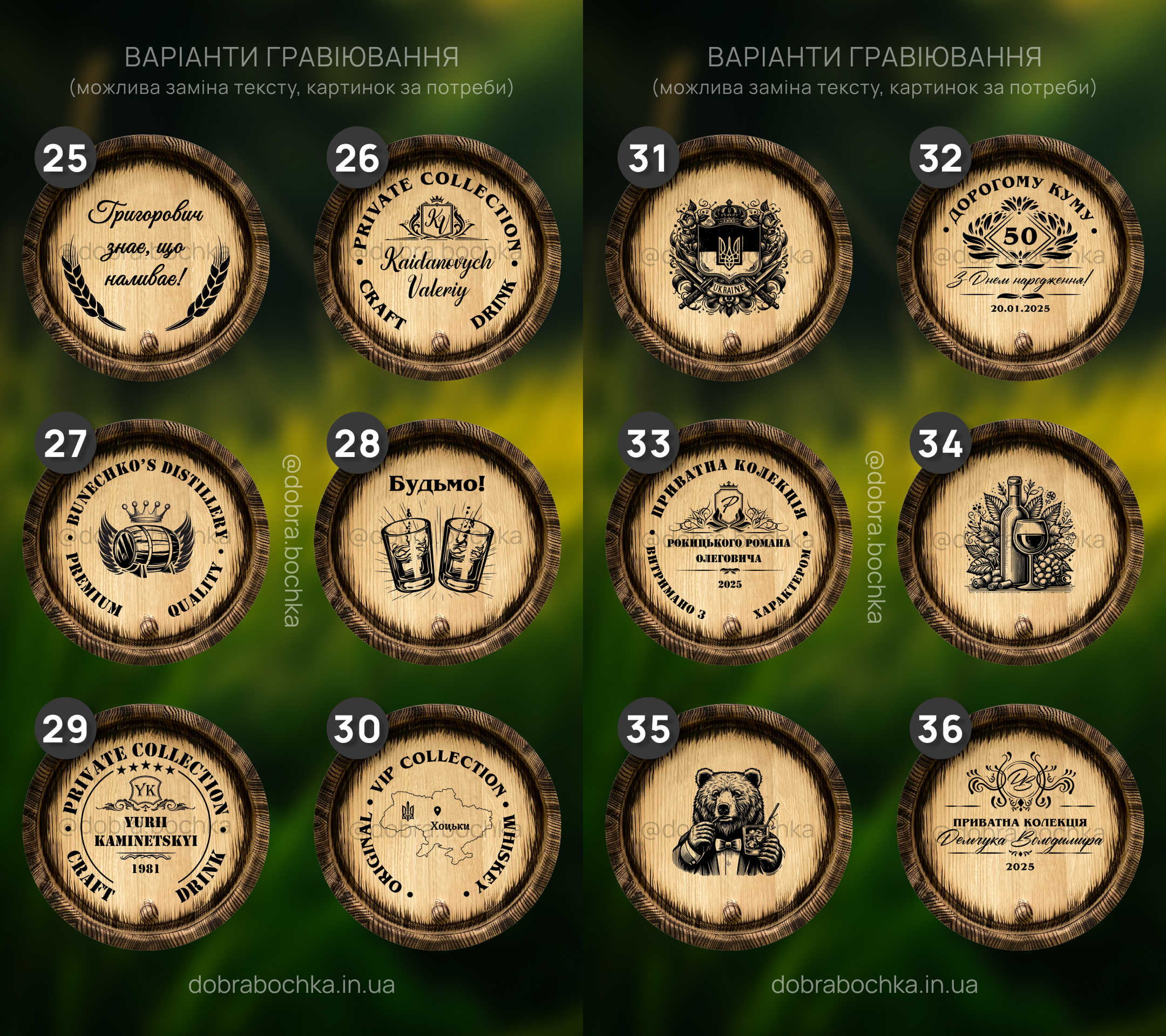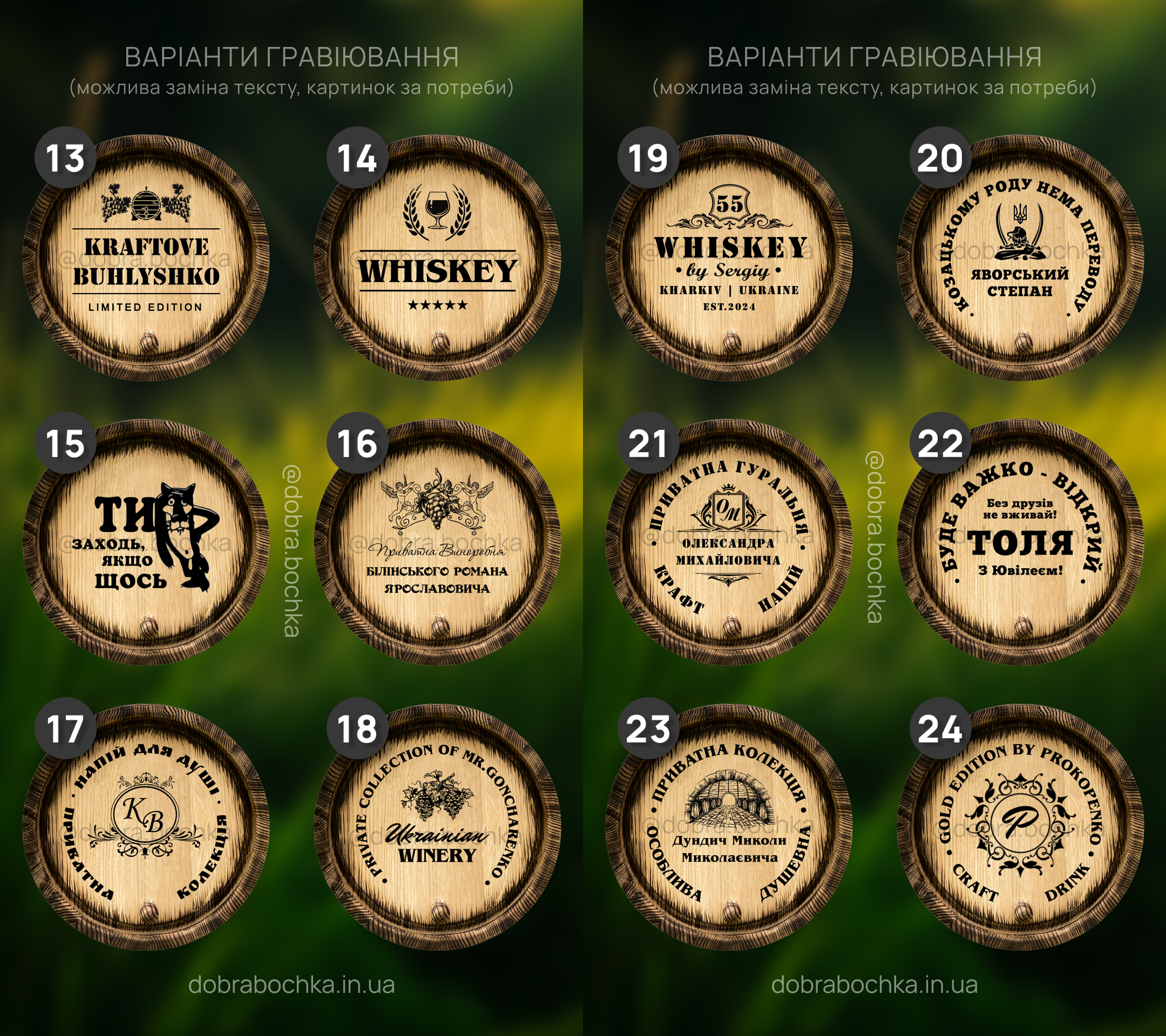 Лазерне гравіювання*: Ми можемо нанести будь-який малюнок, логотип або вітальне слово за вашим ескізом (*бочки з гравіюванням відправляються замовникам лише за попереднім авансом).